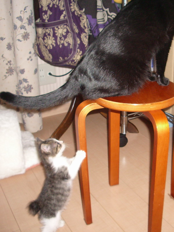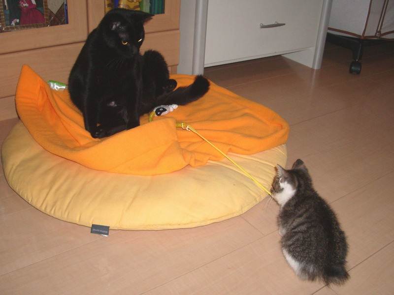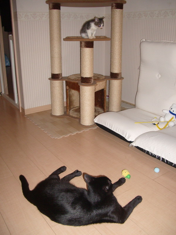 いつまでも遊び、寝ている「たまる」にちょっかいをかける。
